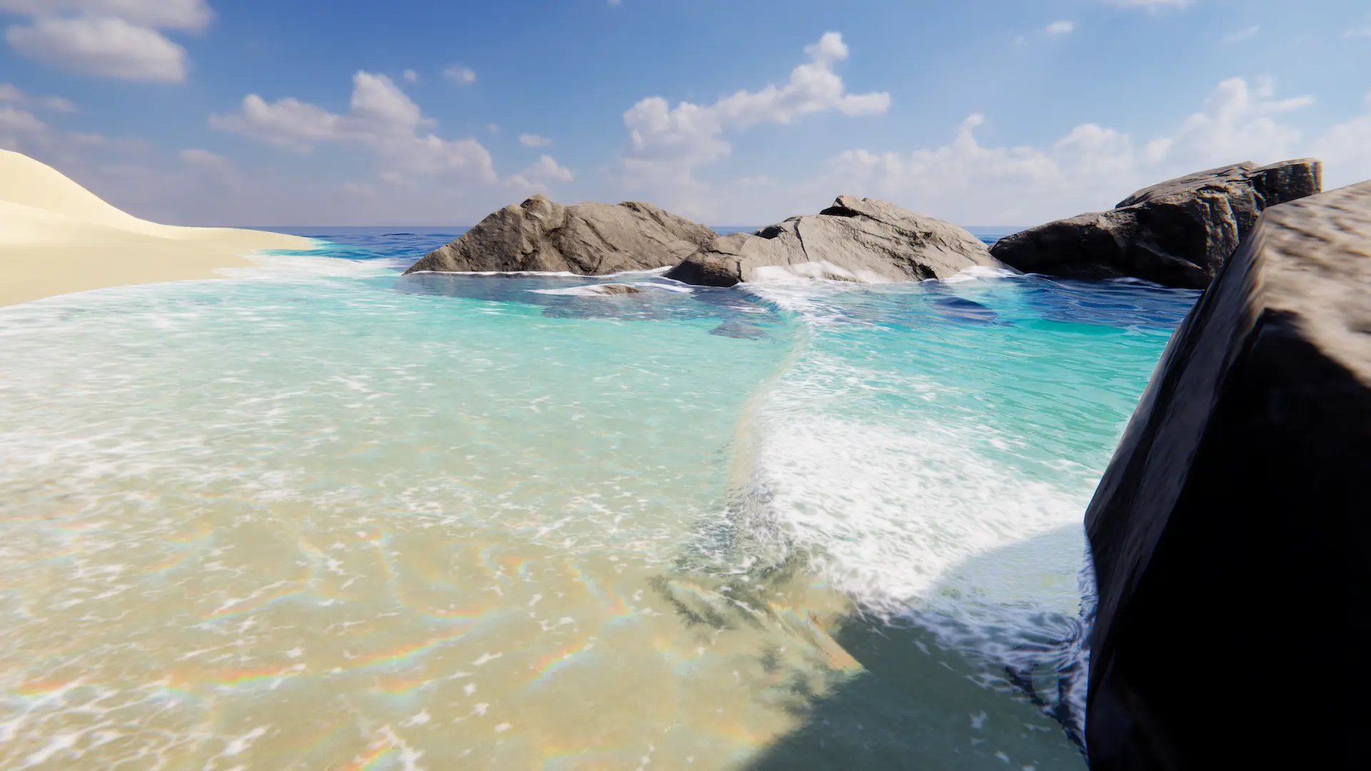 The simulation can be combined with normal waves to simulated shoreline wave behavior. The shoreline simulation is a function of displacement (ie Animated Waves simulation).